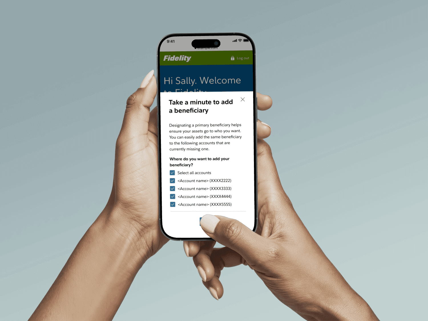 With few taps, Sally finalizes the beneficiaries addition for her accounts